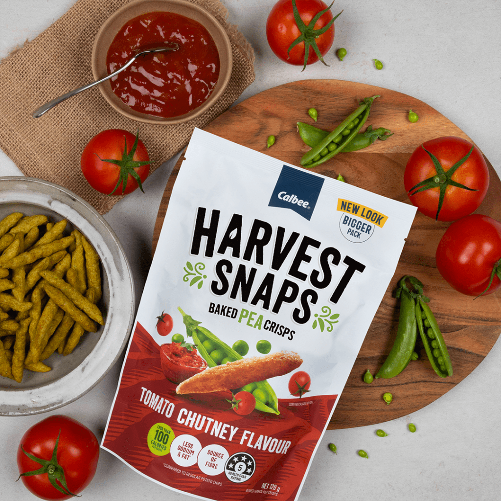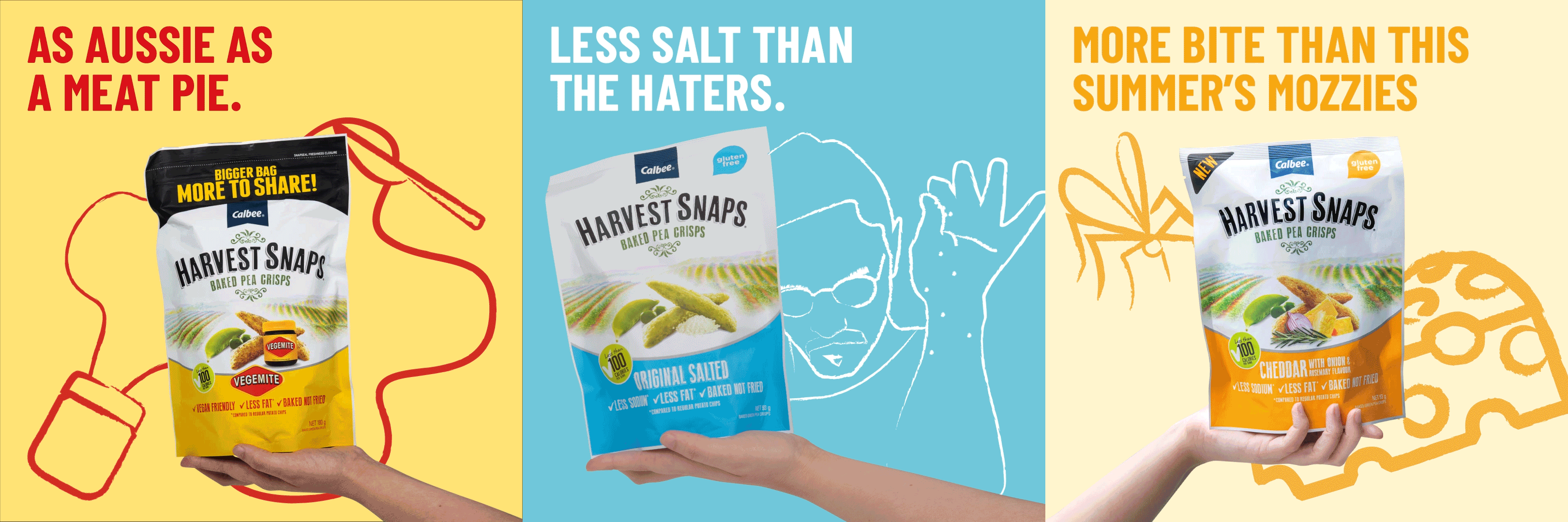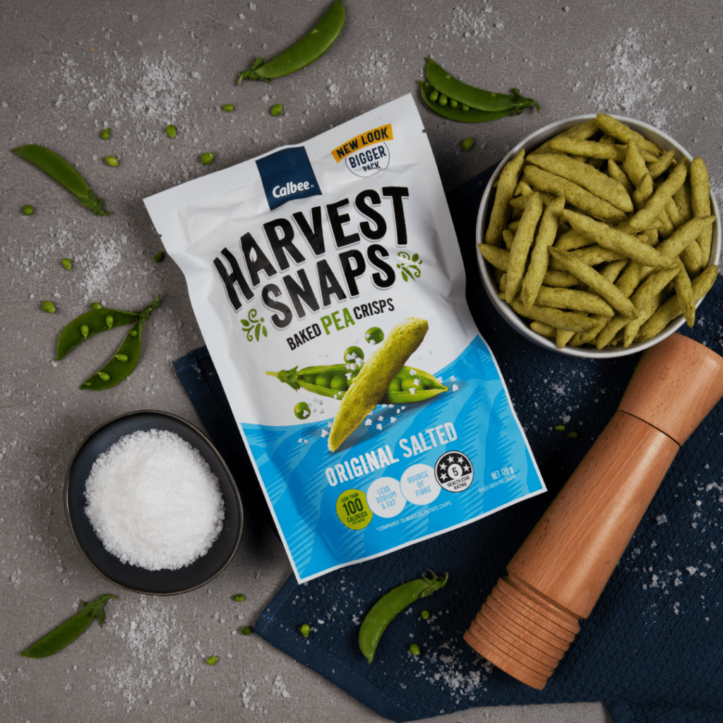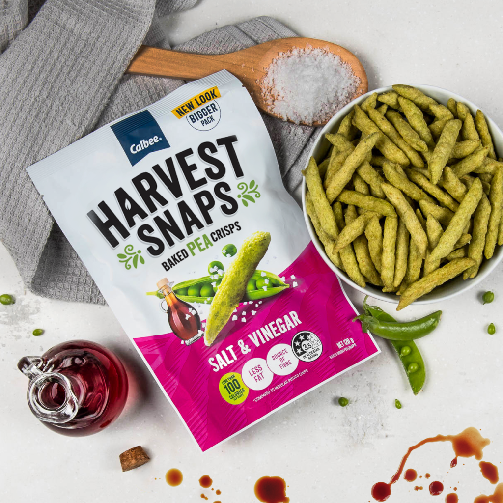 Harvest Snaps is a brand launched by Calbee Australia to provide salty snacks that are a healthier alternative to traditional potato chips. Made from peas and available in a 5 star health rating, Harvest Snaps are targeted towards healthy-minded individuals.